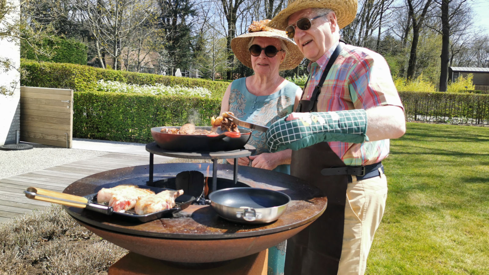 Na een glaasje (of meerdere) champagne kregen we enkele lekkere hapjes voorgeschoteld intussen waren de houtblokken al in brand gestoken om een lekkere steak te bakken, in elk geval was het geen traditionele barbecue waarop Jean zijn bakkunsten liet zien onder het “strenge” oog van Jo 🙂