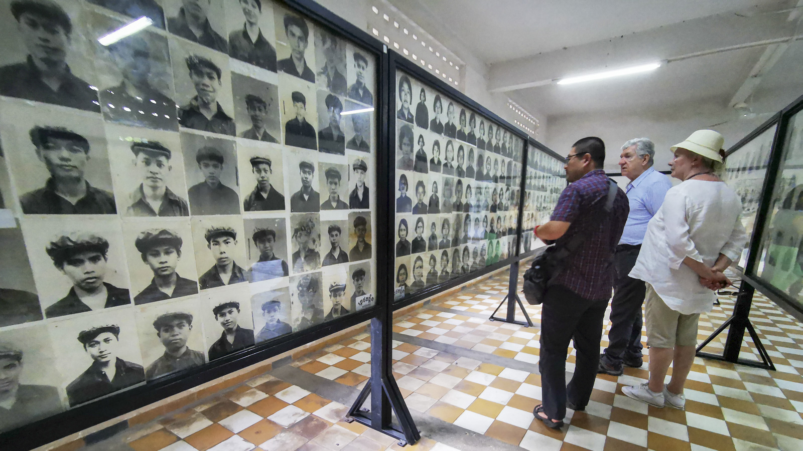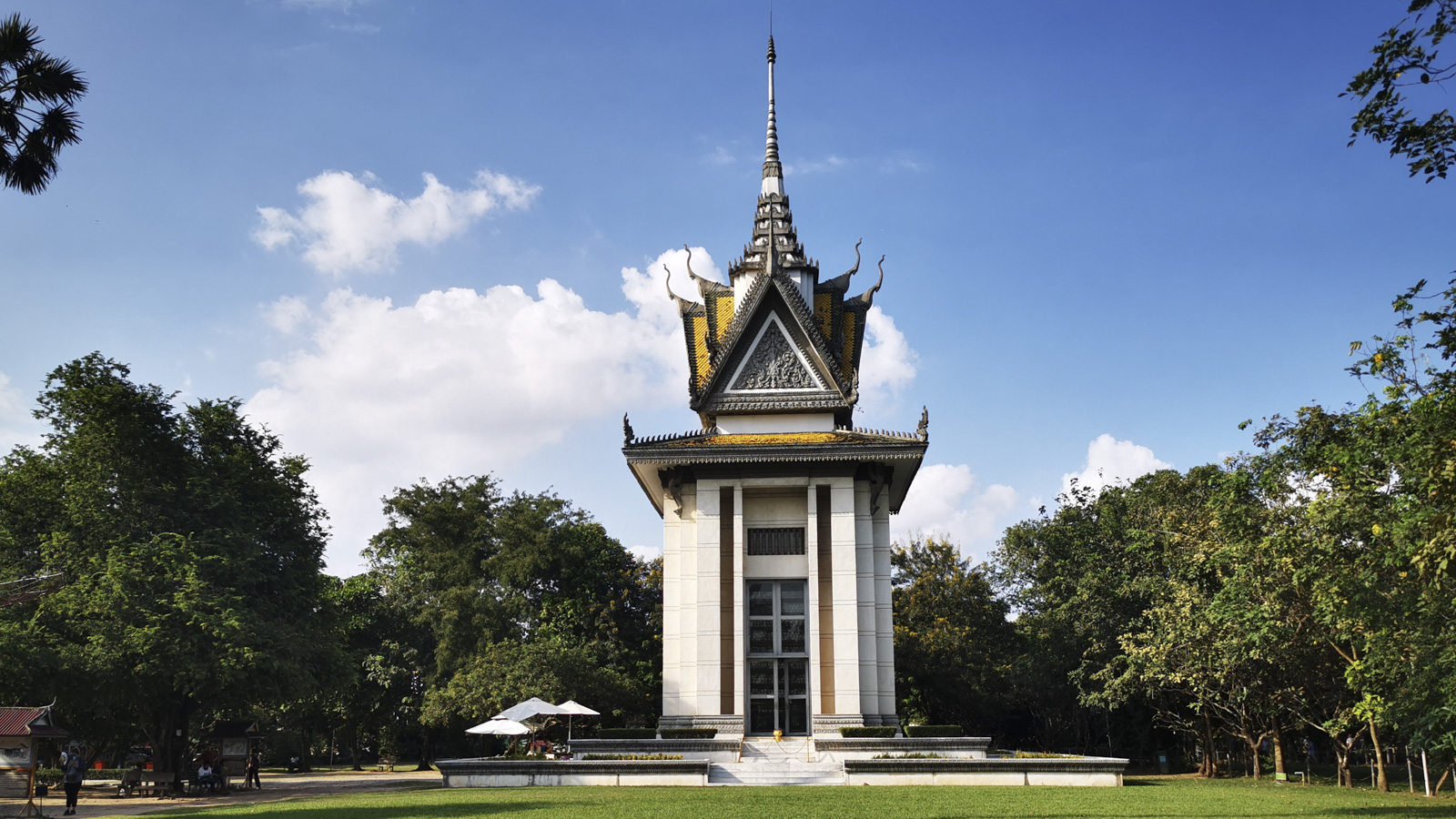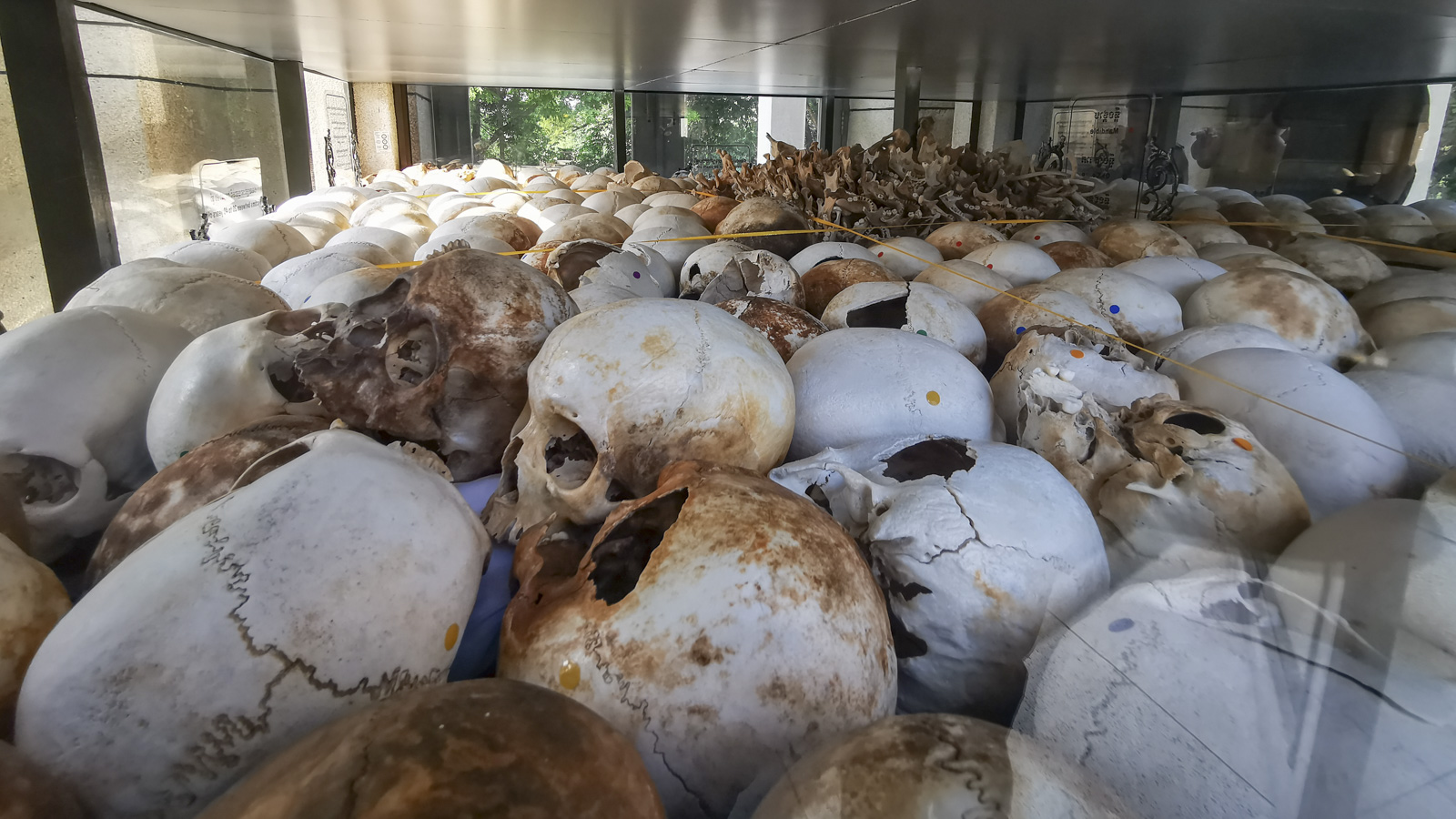 In een monument, een witte toren (stupa) met glazen ramen, liggen veel schedels, gesorteerd naar kinderen/volwassenen en man/vrouw en gemerkt met kleurcodes per moordwapen