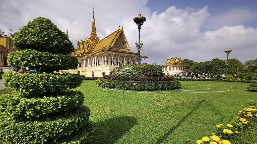 De bedden zijn van uitstekende kwaliteit en iedereen heeft afgelopen nacht dan ook heel goed geslapen. Om 9h00 stipt staat de gids ons op te wachten, eerst gaan we het koninklijk paleis bezoeken, het is maar een kort ritje van 1km. Het is nog maar 9h30 en het is al bloedheet (30° C) , het zweet begint al van het voorhoofd te lopen pffff pffff ….. Het paleis van de Cambodjaanse koningen uit 1866 is rijkelijk versierd en een voorbeeld van de Khmer-architectuur.