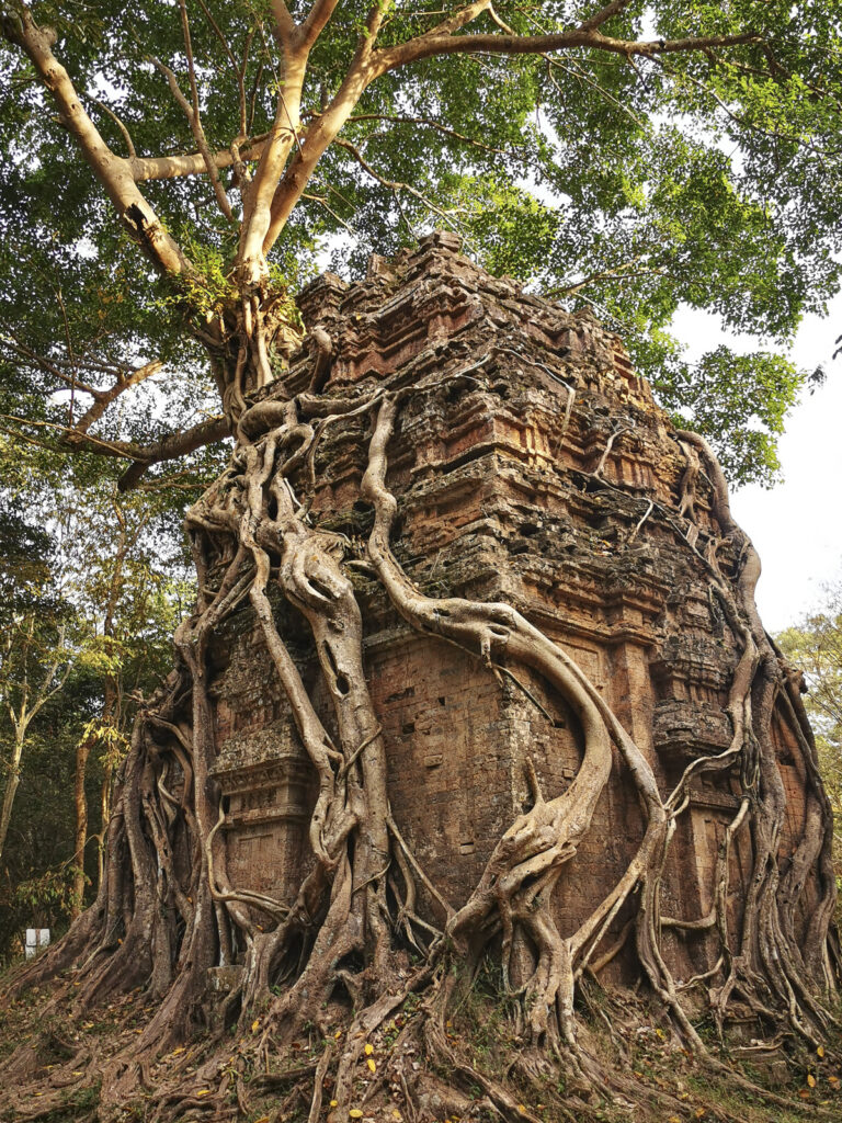 We zetten onze tocht verder naar het noorden, na een goed halfuurtje verlaten we de hoofdweg en rijden zo’n 15 km in het binnenland naar een archeologische site waar ze nog volop met opgravingen bezig zijn en er mooie tempels staan maar vooral de bomen die met hun wortels alles overwoekeren is prachtig om te zien.