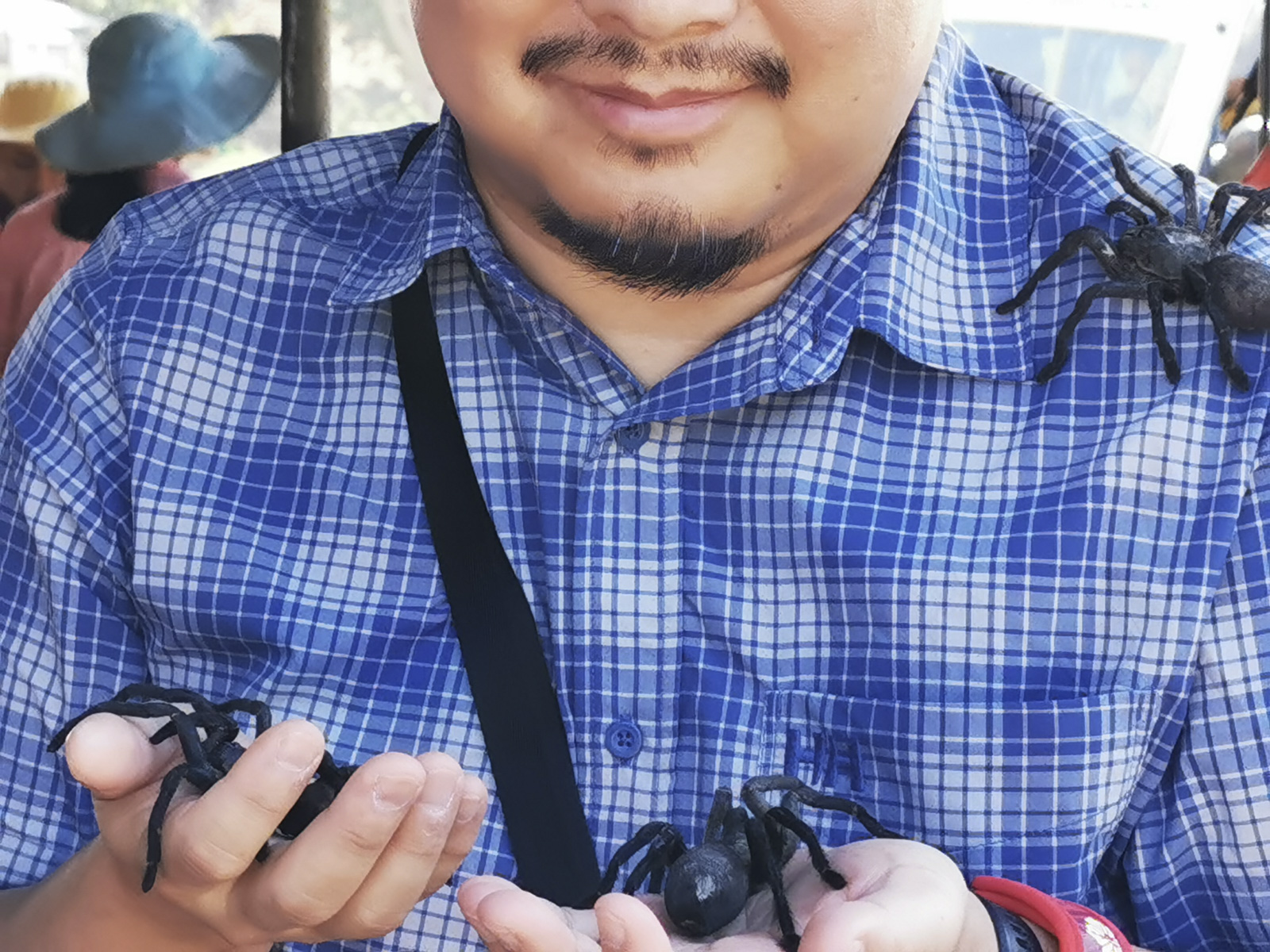 Onderweg zien we geregeld mensen met een klein kraampjes staan die voornamelijk eten verkopen, we stoppen dan ook af en toe eens om te proeven. Na anderhalf uur rijden komen we aan in Skuon beter gekend als ‘Spider Village‘ waar we (alé toch Paco) naar uitkijken. We stappen nog maar net uit het busje en er komen al kinderen met levende tarantulas op ons af… toch wat achteruit gaan want de spinnen zien er toch wat groter uit dan ik had verwacht. Op deze markt kan je niet alleen tarantulas eten maar ook vele andere insecten, ik ben alvast blij dat we weer in het busje zitten 🙂