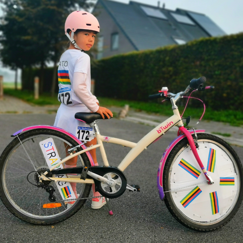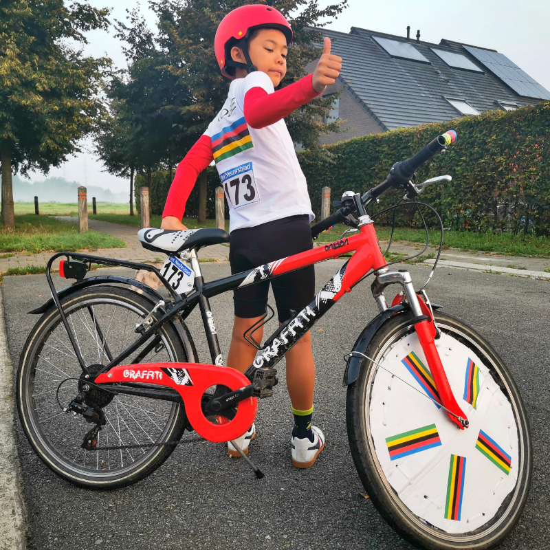 De kinderen mochten hun fiets om het leukste/mooiste pimpen en elke klas kon dan op de beste gepimpte fiets stemmen. Papa had de fiets van Kato & Kobe getransformeerd naar een “echte” tijdritfiets met “volle” wielen. Oma Eliane had ook nog de prints op hun T-shirt gestreken zodat ze volledig in het WK-thema pasten.