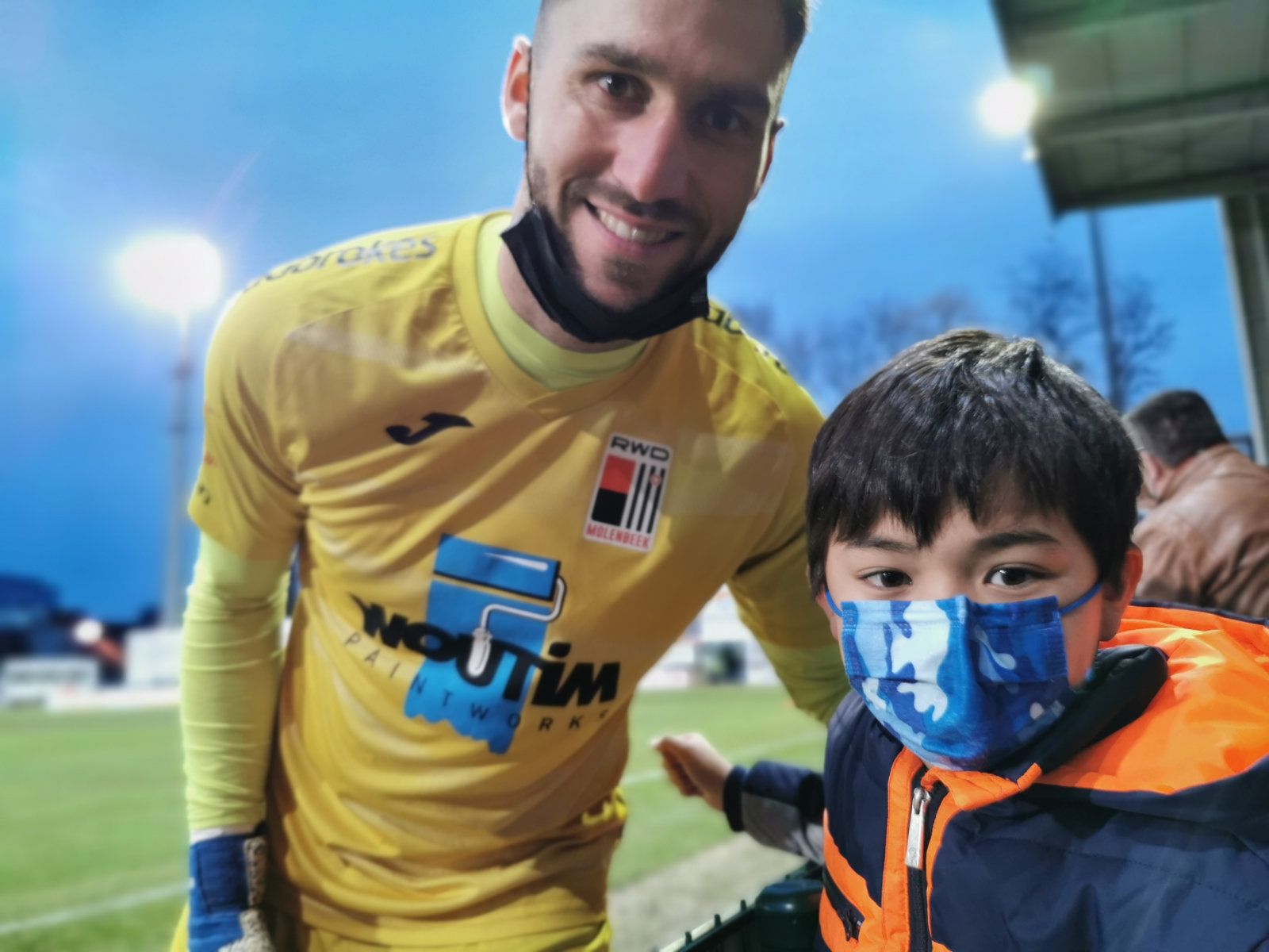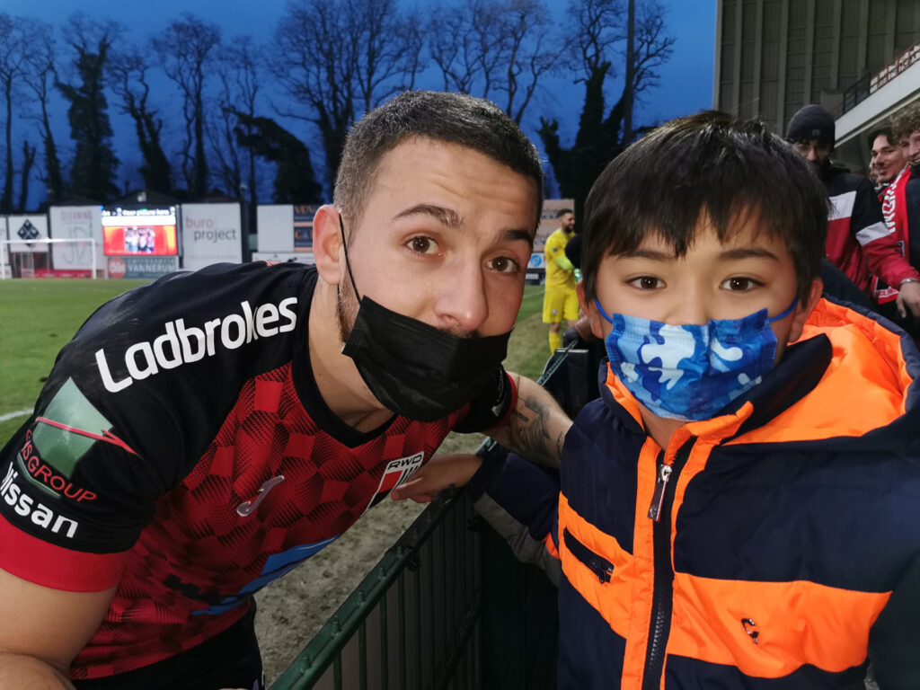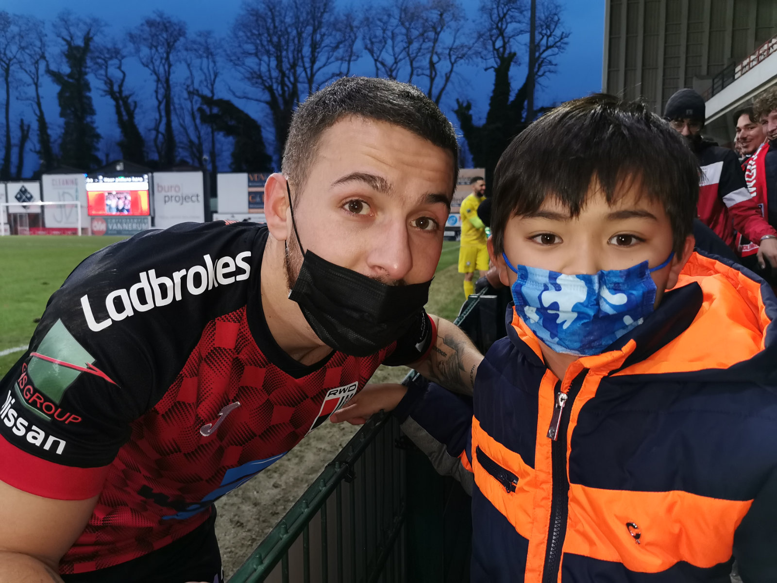 De sfeer was zoals in de oude gloriedagen van RWDM, naar schatting 5000 à 6000 toeschouwers maar misschien had dit ook te maken dat de inkom maar 3€ was voor een volwassen en kinderen -12 gratis. We zaten net naast de ere-tribune en konden alles mooi volgen , alhoewel Kobe geregeld om mijn schoot kwam zitten om toch wat beter te kunnen kijken. Na de wedstrijd op de foto met nieuwkomer Kylian Hazard , jawel broer van Thorgan en Eden.